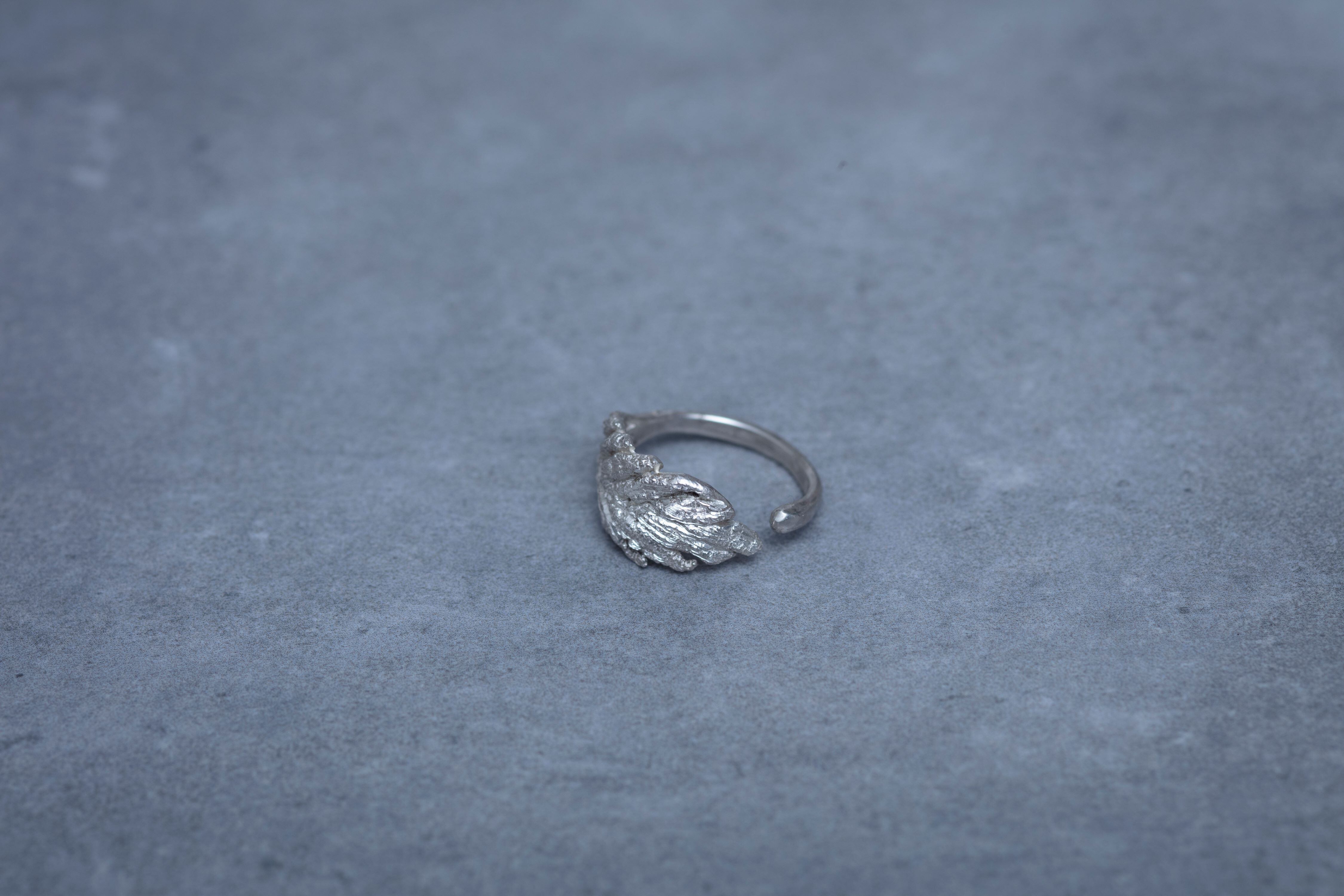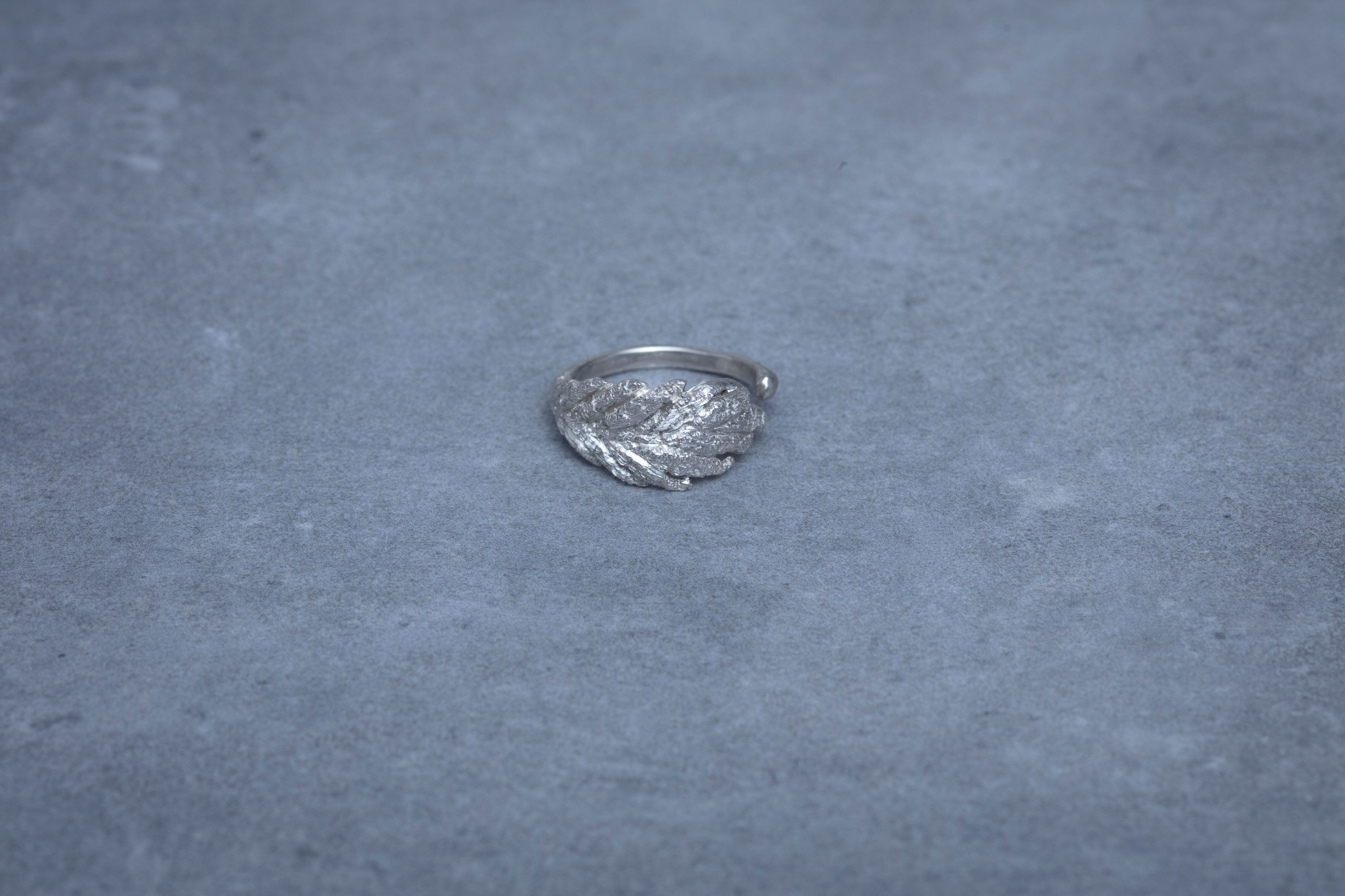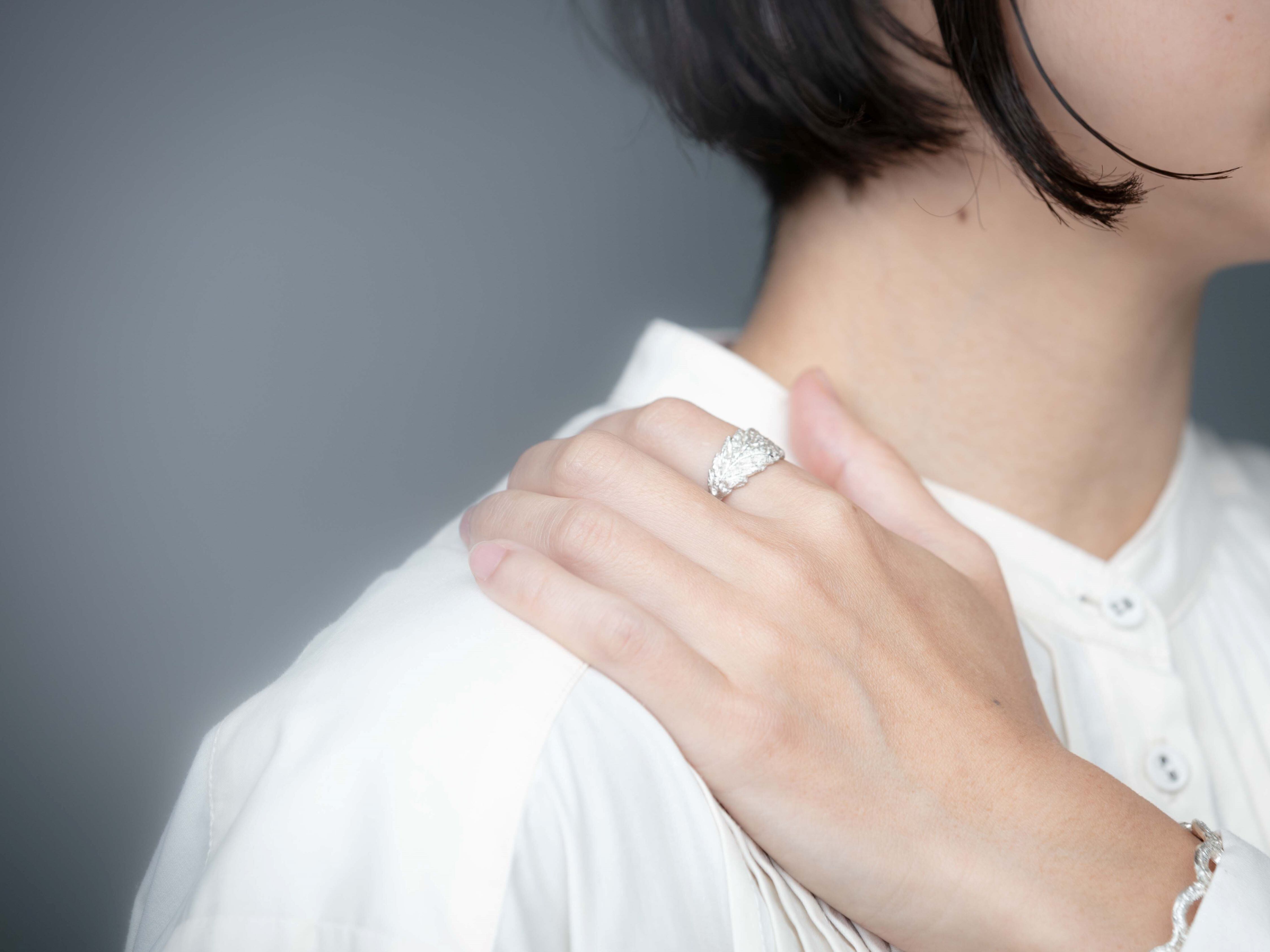 凛とした雰囲気を漂わせた、麻の葉モチーフのリングです。手編みの細やかな糸目の陰影と、柔らかい曲線で植物が持つ自然な美しさを表現しています。高品質なスターリングシルバーとハンドメイドの質感は柔らかい雰囲気を作り上げ、デイリーにもフォーマルにも合わせやすいのが魅力です。フリーリングなので、自分のサイズにぴったり合うように調節して身につけてください。